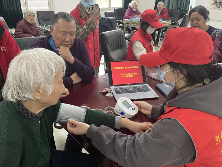 下午3点,在退休人员活动室,智慧健康学院的赵瑞洁老师为大家讲了高血压的相关知识——高血压的产生的原因、高血压的标准,然后组织学生志愿者为退休教职工量血压。测量时并提醒老职工平日要合理饮食,时刻关注自己的血压变化,关心自己的身体状况。