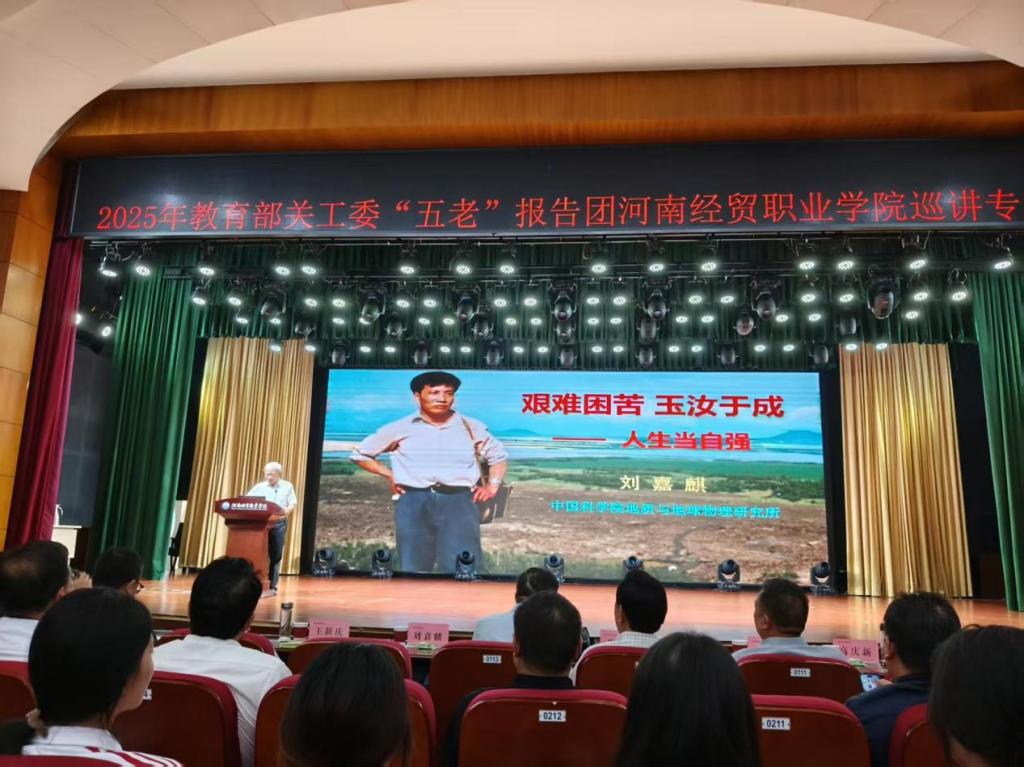 聆听老辈故事,传承时代薪火。9月11日下午,我校关工委委员、“五老”代表、教师代表赵军华、王红友、曹奇星、郭来州等12位同志冒雨赴河南经贸职业学院1号教学楼报告厅,参加2025年教育部关工委“五老”报告团成员刘嘉麒院士巡讲专场报告会。