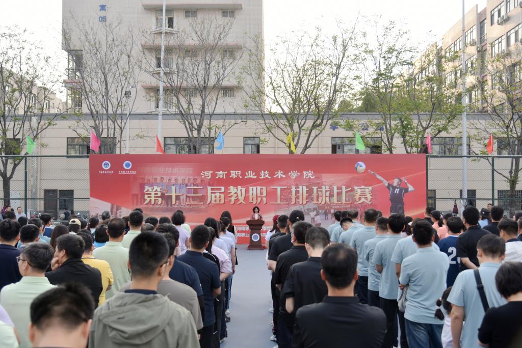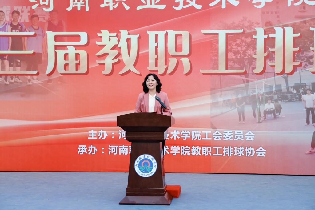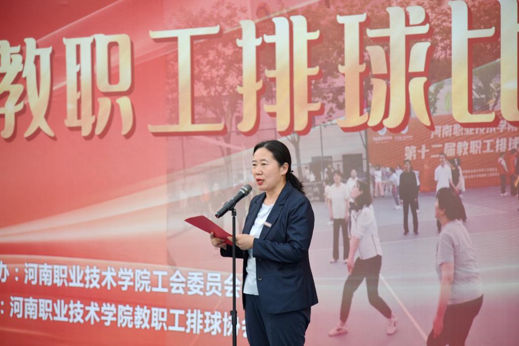 校党委副书记、校长夏新颜作开幕致辞并宣布第十三届教职工排球比赛开幕。她对本次比赛表示热烈祝贺,并向参赛的全体队员、裁判员和工作人员致以诚挚问候。她指出,排球比赛是校园文化的重要组成部分,不仅是一场竞技,更是一次交流与合作的盛会。希望全体队员发扬“勇于担当,敢拼敢闯,永不服输,追求卓越”的河职精神,赛出风格、赛出水平,以更加饱满的热情和更加优异的成绩,推动学校阳光体育运动蓬勃发展,为学校“新双高”和职教本科建设提供澎湃动能。